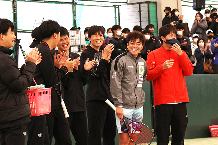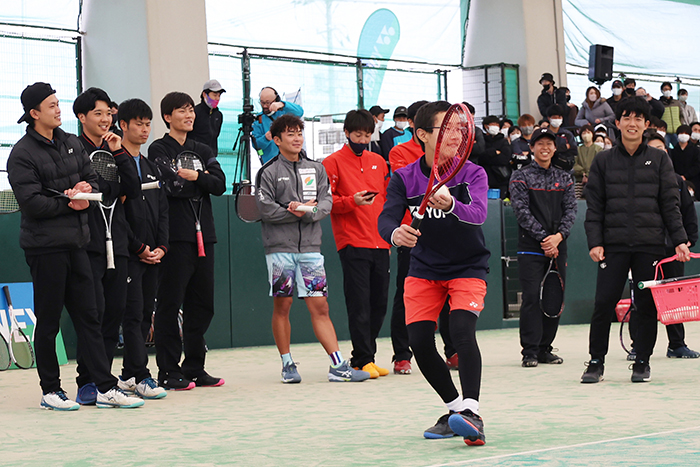 今回のイベントには国内トップ選手が一挙に10名が参加。船水颯人選手(稲門クラブ)、丸山海斗選手(Up Rise)のプロ選手、NTT西日本の日本代表ペアである内本隆文選手、内田理久選手、そして地元宇部市に拠点を置くUBEより河村侑哉選手、越智大輔選手など錚々たるメンバーが集まり、ソフトテニスを通してファンと交流しました。