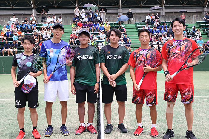 また今回のワールドチャレンジでは、過去にないほどの国内のトッププレイヤーが勢ぞろい。船水颯人(稲門クラブ)、丸山海斗(Up Rise)の国内トッププロを始め、早稲田大学からレギュラーメンバーの荒木駿、吉岡藍、東海地区を拠点に活動する東邦ガスから仲川晴智、大友駿、太平洋工業から立木雅也、齋藤龍二の各選手、2022年に発足した三重県の実業団ヨシザワのメンバー、三重高校出身で2022シーズン大活躍した橋本旭選手など東海地区のソフトテニスを牽引する豪華メンバーがイベントを一緒に盛り上げました。