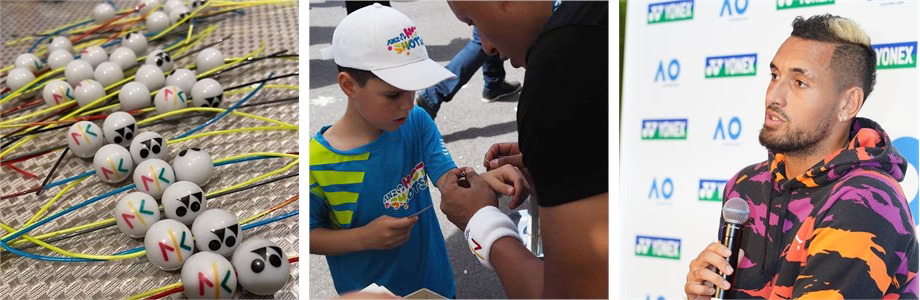 NK Foundation は、Team Yonexのプロテニスプレーヤー ニック・キリオスが設立した基金で、恵まれない環境にある子供たちにスポーツに触れ、楽しむ機会を提供することを目的とする施設の建設を計画しています。ヨネックスはNK Foundationの趣旨に賛同して活動を支援しており、2020年の全豪オープンでは、全豪オープンの試合で実際に使用されたストリングを再利用してブレスレットを制作し、NK Foundationに寄付をした人に進呈することで支援の輪を広げる活動を行いました。