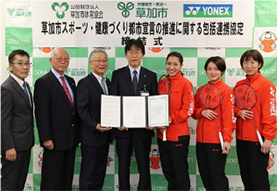 埼玉県草加市、草加市体育協会とヨネックスは「草加市スポーツ・健康づくり都市宣言」の趣旨に基づき、市民の皆様がスポーツを通じて健康でより豊かな生活を送ることができるまちづくりを目指し、互いに持つ資源を活用して連携を図り、市民の皆様に寄与することを目的として包括連携協定を結んでいます。 草加市は、弊社東京工場やバドミントンチームが練習拠点を置くなど、弊社とゆかりのある自治体であり、地域活性化に貢献する取り組みを行っています。