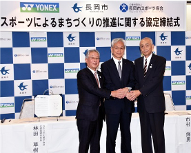 新潟県長岡市、長岡市スポーツ協会とヨネックスは、互いに持つ資源を活用して、スポーツの振興や市民の皆様の健康増進などの地域社会の発展に寄与することを目的に包括連結協定を結んでいます。 長岡市は、弊社新潟工場や女子プロゴルフトーナメントの一つである「ヨネックスレディース」を1999年から開催するなど、弊社と非常にゆかりの深い自治体であり、様々な取り組みをともに行っています。