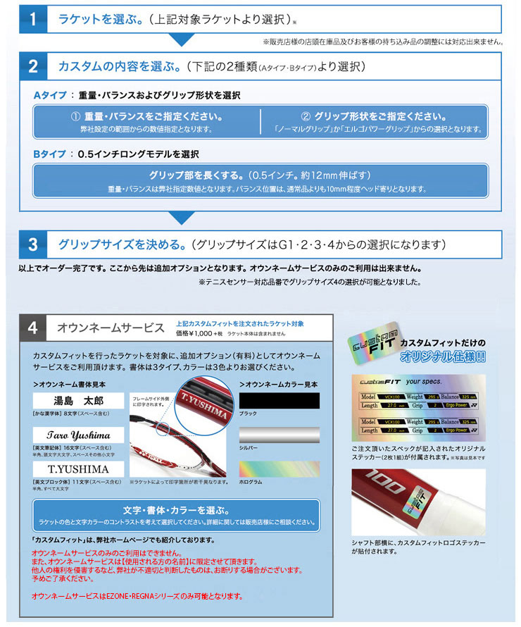こだわりを持つプレーヤーを対象に、テニスラケットの重量・バランス・グリップ形状、またはラケット全長をお好みに合わせて指定できる「カスタムフィット」を是非、お試しください。
