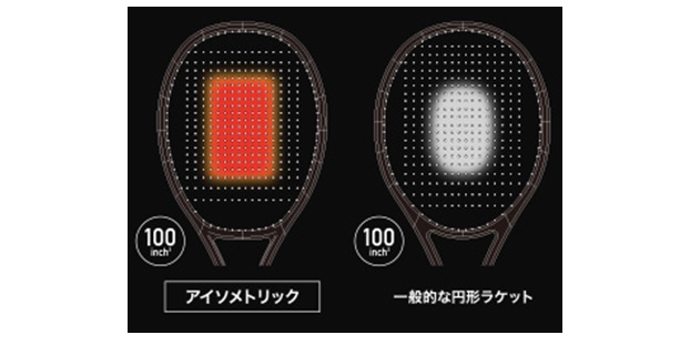 「アイソメトリック®」とは、縦・横ストリングの長さを均等に近づけることで、反発や振動が安定し、一般的な円形ラケットに比べてスウィートエリアが7%※広い、当社独自の形状理論。アイソメトリックの100 inch2は円形ラケットの107inch2に相当します。