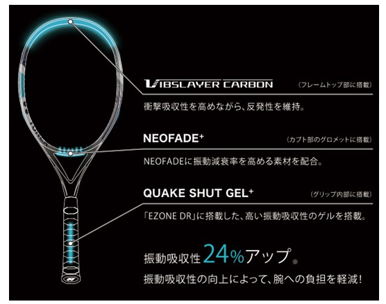 振動吸収性を高めながら反発性を維持する、カーボンに衝撃吸収材を層状に複合した「バイブスレイヤーカーボン」をフレームトップ部に搭載。さらに、構造体の共振を抑え、振動を効率良く減衰させる「ネオフェード+」、振動吸収性ゲルと3つの素材で、衝撃吸収性24%※向上。腕への負担を軽減し、楽にボールが打て、長時間プレーを楽しめます。