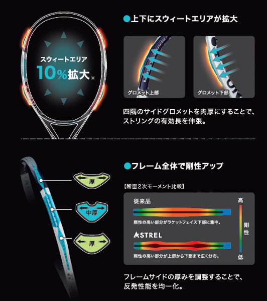 ASTRELは、特に40代以上のテニス愛好者層が求めている、飛び、コントロール性能、打球感の柔らかさに加え、