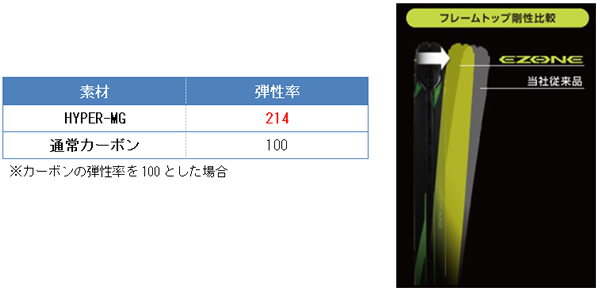 フレームトップ部にヨネックス史上最も弾性率の高いカーボン素材「HYPER-MG」を搭載。フレームのたわみで柔らかい打球感はキープしつつ、フレームトップ部の剛性を5%向上させ、しなりを抑え反発性能をアップさせました。