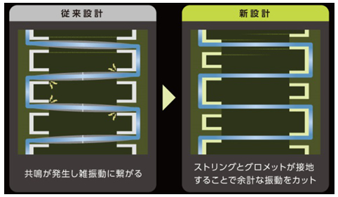 グロメット(ストリングを保護するパーツ)の配向位置を緻密に設計し、ストリングとグロメットを密に接地させることで雑振動を大幅カット。快適な打球感を実現します。