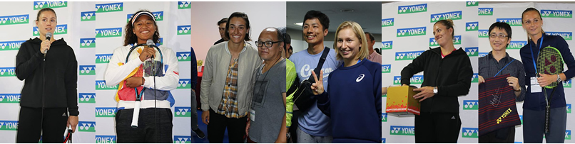 選手が入場すると、「可愛い!」「スタイルが良い!」とファンは大興奮。トークショーでは選手とMC、通訳との軽妙なやりとりで笑いを誘い、会場は大いに盛り上がりました。ケルバーは、先日ヨネックスの工場を見学したことについて「手作業の工程もあり、ヨネックス独自の高品質な製品で戦えることを誇りに思います」と語り、新製品New EZONEを使用するガブリロバは「ディフェンシブなラリーでもパワーと飛びが良く助かります」、リバリコバも「振動が少なく使いやすい。スライスも素晴らしい」と、それぞれツアー初優勝と怪我から復帰後の好調な要因に挙げてくれました。