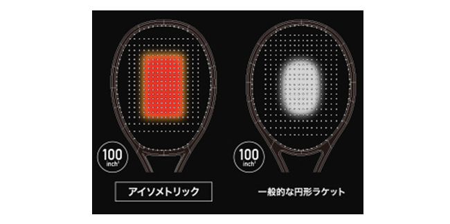「アイソメトリック®」とは、縦・横ストリングの長さを均等に近づけることで、 高反発エリアが拡大し、一般的な円形ラケットに比べてスウィートエリアが7%※広い、 独自の形状理論。アイソメトリックの100 inch2は円形ラケットの107inch2に相当します。
