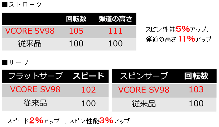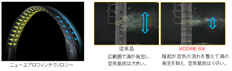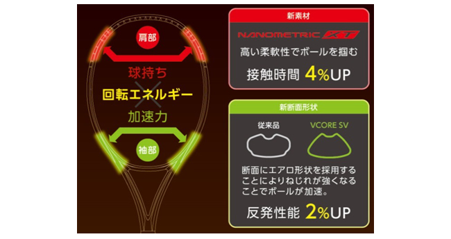弊社は、テニスラケットすべてに、縦・横ストリングの長さを均等に近づけることで、高反発エリアが拡大し、一般的なラケットに比べスウィートエリアが7%※広いアイソメトリック形状を採用しております。加えてVCORE SVは突起のあるフレーム形状「ニューエアロフィンテクノロジー」(特許出願中)を採用し、空気抵抗を大幅に低減し振り抜きを向上させ、強烈なハイスピンボールを実現します。