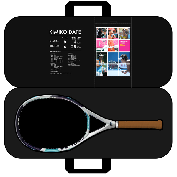 ケース表面に伊達のサイン、ケース内側には伊達の過去の戦績のプリント入り。 ラケットと「伊達公子-ヨネックス ヒストリーフォトブック」が収納可能。