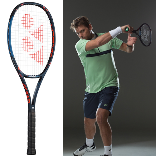 ヘビードライブを生むVCORE PRO97と(左)、 ラケットを使用予定のグランドスラム3勝のスタン・ワウリンカ(スイス)