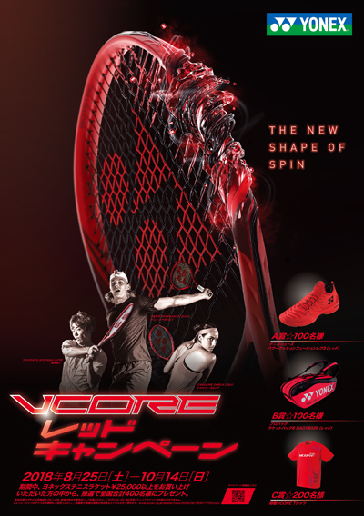 優れたスピン性能が支持され、デニス・シャポバロフ(カナダ)、キャロリン・ガルシア(フランス)、西岡良仁などのトップ選手が愛用するNEW VCOREシリーズの発売を記念して、「VCORE レッドキャンペーン」を開催します。期間中にキャンペーン参加店にて、メーカー希望小売価格25,000円以上のテニスラケットをお買い上げいただいた方に、レッドづくしの賞品を抽選で全国合計400名様にプレゼント。この機会にぜひVCOREの購入をご検討ください!