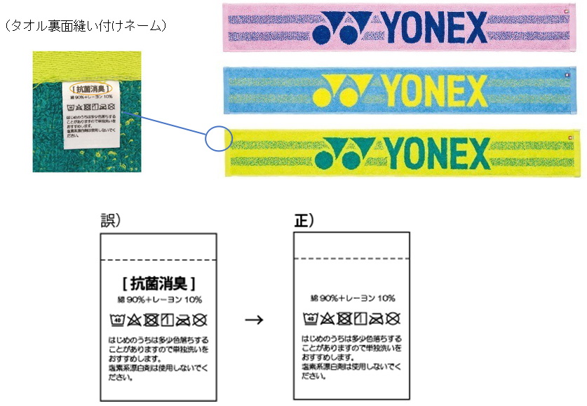 このたび、2017年9月より発売致しました『AC1056 マフラータオル』において、縫い付けネームの機能表示内容に誤りがあることが判明致しました。当該商品をお買い求めいただきましたお客様にはご迷惑をお掛けしたこと深くお詫び申し上げます。