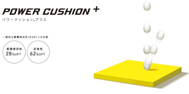 パワークッションに反発性の高い特殊樹脂を添加し、+型の溝を最適な間隔と深さで格子状に配置した新構造を採用した「パワークッションプラス」は、従来の軽量性を保ちつつ、衝撃吸収性を28%、反発性を62%アップさせ(一般的な衝撃吸収材[EVA]との比較)、12mの高さから落とした生卵が、割れずに6m以上跳ね返る新衝撃吸収反発素材です。