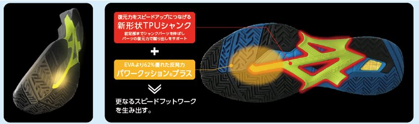 樹脂製のTPUシャンクを中足部から前足部まで伸ばすことで、足を踏み込んだときにシャンクパーツの復元力が蹴り出しをサポート。さらに新衝撃吸収反発素材のパワークッションプラスとの相乗効果で推進力を生み、俊敏なフットワークを実現します。