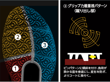 下図①(赤)は中央のピンパターンを他のピンパターンより高く設計し、コートに食付きやすくすることで、グリップ力を向上。