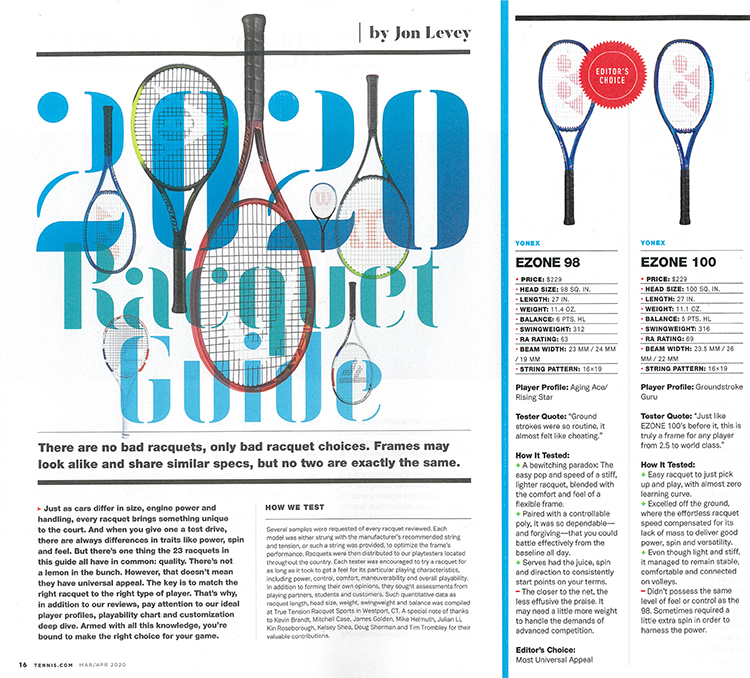 同誌では各メーカーのラケット23本を対象に、一般愛好者やコーチなどがテスターとなり、パワーやコントロール性能などの項目で評価を実施。EZONE 98はベースラインから安定してストロークを打つことが出来る高性能を賞賛され、「力まなくても威力のあるボールが打てる。快適で打球感が柔らかい」と評価されています。