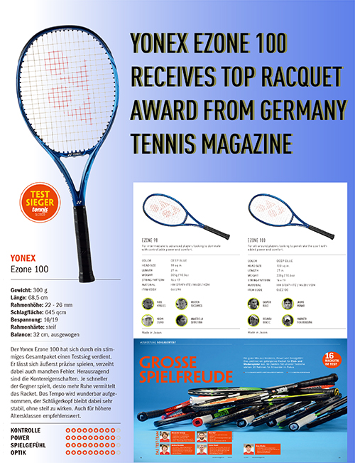 さらにドイツ『テニスマガジン』3月号においても、各メーカーのオールラウンダー向けラケット16本から、EZONE 100が最優秀ラケットに選出されました。「全体的な性能が高く、非常に正確にプレーすることが可能。飛びぬけた攻撃力がある」と評価いただいています。