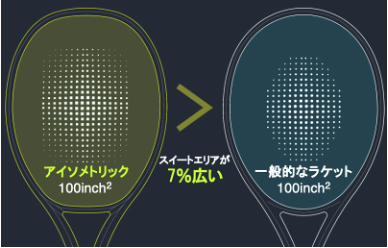 アイソメトリックとは、スウィートエリアを拡大させるヨネックス独自の形状理論。縦横のストリングの長さを均等に近づけることで、一般的な円形ラケットに比べ上下左右に7%※広いスウィートエリアを実現。