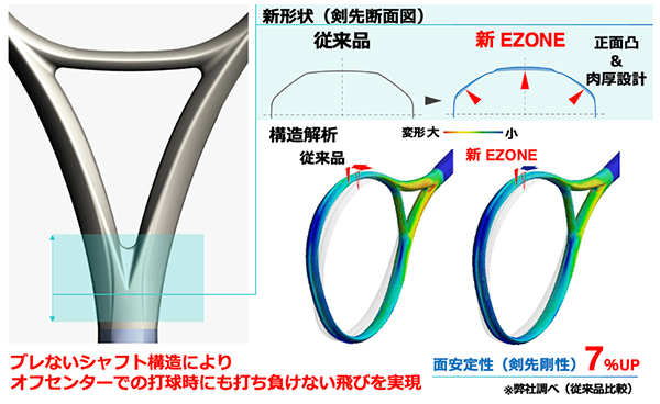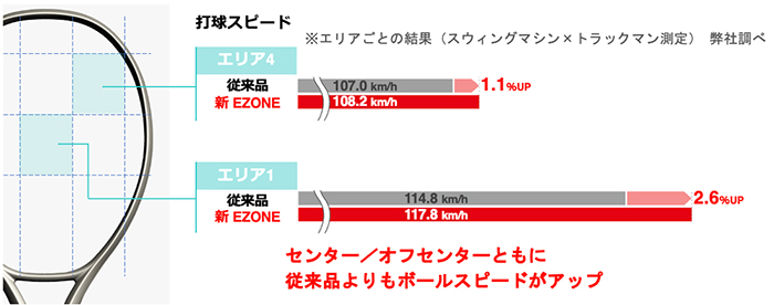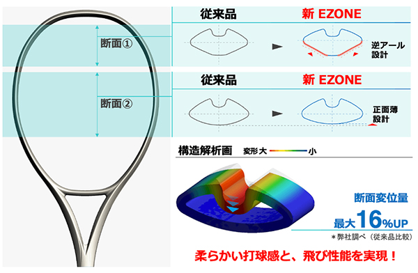 近年のテニスでストロークのラリー戦を制するためには、操作性だけでなく、より強力なパワーとスピードが求められます。そこで新「EZONEシリーズ」は、新素材・新構造を採用することで、柔らかい打球感を高めるとともに、ボールスピードを向上させました。