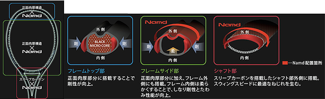 Namd™の配置をフレームトップ部、フレームサイド部、シャフト部と、部位ごとに最適に配置することで、スウィングスピードに応じた最適なねじり戻りを実現。