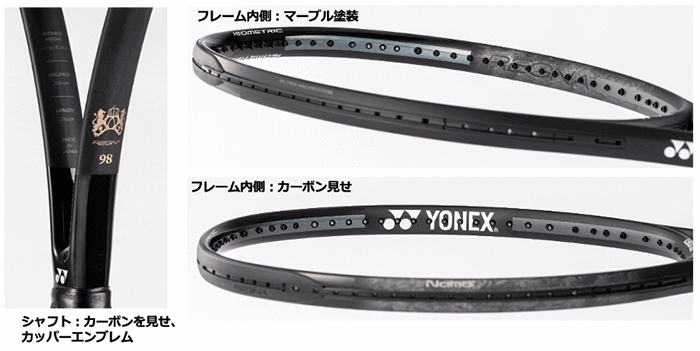 新デザインのコンセプトは、質感の違う黒でシンプルさを追求した「珠玉の黒ラケット」。フレーム部は、つやあり・なし2種類の黒に加えマーブル塗装を採用することで質感の違いを表現。フレーム内部とシャフト部はカーボンを見せ、エンブレムにカッパーを使用し、グリップには黒の天然皮革を用いることで上質感を創出しています。