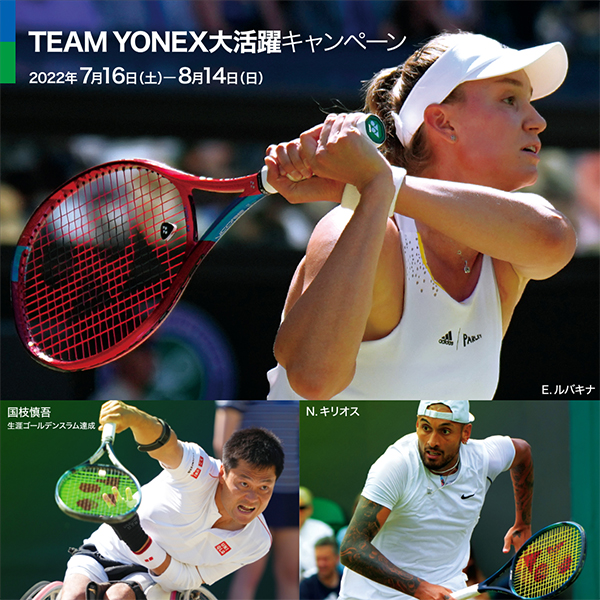 グランドスラムでのE.ルバキナの初優勝や、国枝慎吾の生涯ゴールデンスラム達成など多くのヨネックス選手が活躍していることを記念し、「TEAM YONEX 大活躍キャンペーン」を開催します。