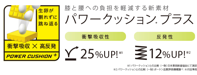7mの高さから生卵を落としても割れずに4m以上跳ね返す衝撃吸収性と反発性を併せ持つ「軽く、疲れにくい」衝撃吸収素材パワークッション。そのパワークッションに反発性の高い特殊樹脂を添加し、そして格子状に+型の溝を最適な間隔と深さで配置した新構造を採用し、従来の軽量性は保ちつつ、衝撃吸収性を25%、反発性を12%アップした新衝撃吸収反発素材。