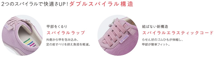 また、甲部をくるりと包みこむスパイラルラップ構造とらせん状に設計されたゴムひもを採用した「ダブルスパイラル構造」が、靴内での足の前滑りを防ぐと共にフィット感を高めています。そして内側に設けたファスナーとゴムひもによって、着脱しやすいウォーキングシューズとなっています。