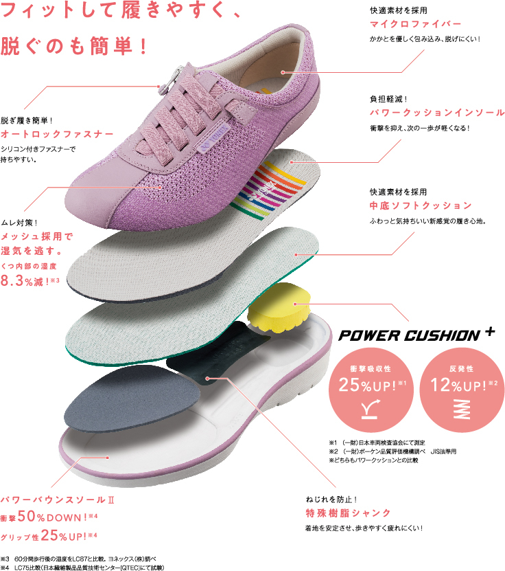 弊社最大の機能であるパワークッションは、7mの高さから生卵を落としても割れずに4m以上跳ね返す※1衝撃吸収性と反発性を併せ持つ「軽く、疲れにくい」衝撃吸収素材です。そのパワークッションより衝撃吸収性を25%※2、反発性を12%※3アップさせた「パワークッションプラス」をかかと部に重点配置する事で膝と腰をやさしくサポートします。