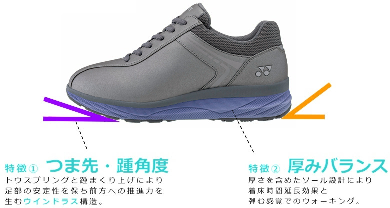 本商品は前方への推進力を高めるためにつま先とかかとに角度をつけ、つま先を上がりやすくするとともに、ソールは厚みを設けた設計にする事により、歩行時の衝撃をゆっくりと吸収し反発に変えるため、無理なく自然な形で歩幅を伸ばすことができます。