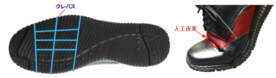 ソールにクレバス(深く細い溝)を施すことで変形しやすくなり、屈曲性が向上。アッパーの屈曲部位にも柔らかい人工皮革を使用し、ソールとアッパー両面から屈曲性を高めます。屈曲性の高いソールは衝撃を吸収しやすく、快適な歩行をサポートします。