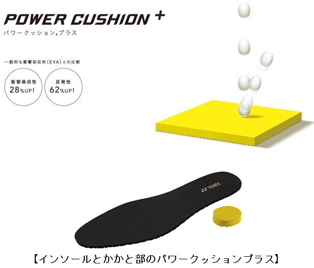 衝撃吸収性と反発性を併せ持つ、「軽く、疲れにくい」を特徴としたヨネックス独自の衝撃吸収反発素材「パワークッション」。