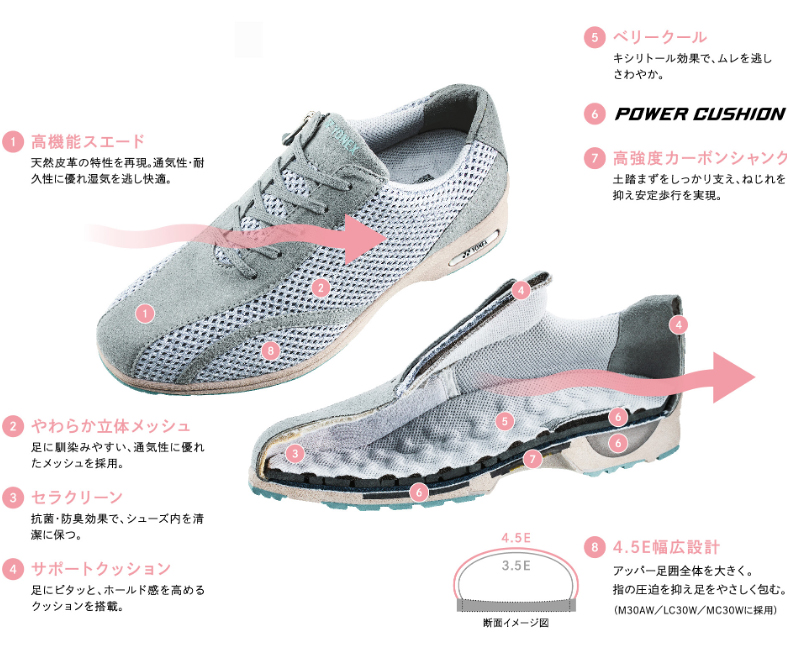 7mの高さから生卵を落としても割れずに4m以上跳ね返す衝撃吸収力と反発力を併せ持つ衝撃吸収素材「パワークッション」をインソール部分全体に加えミッドソールの踏みつけ部分と踵にも搭載。さらに足の捻れウォ防ぐ「カーボンシャンク」を中足部に配置し、足への衝撃緩和と歩き出しやすさをサポートします。また、ソールには波状の切れ込みを入れたレイングリップソールを採用し、濡れた路面でも滑りにくくなっています。 また、ソールには波状の切れ込みを入れた「レイングリップソール」を採用し、濡れた路面でも滑りにくくなっています。 また、男性用のM30メッシュWは、足囲全体を大きくした4.5Eを採用。指への圧迫を少なくしてやさしく包み込む設計です。