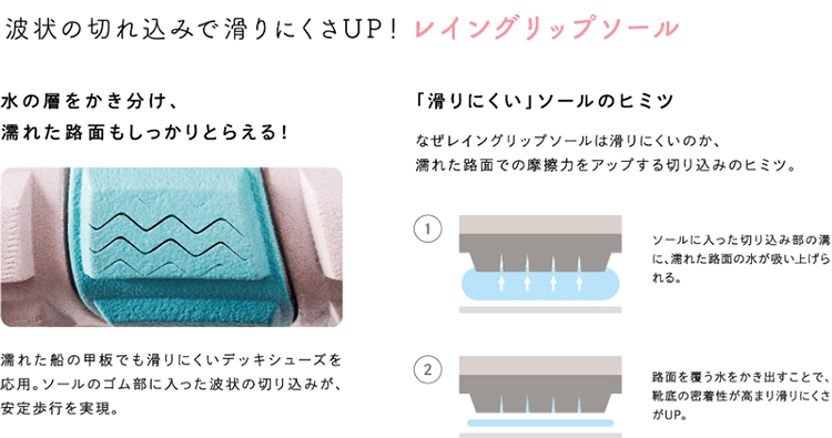 ウォーキングシューズで最も大切なポイントとなる快適な履き心地は、7mの高さから生卵を落としても割れずに4m以上跳ね返す衝撃吸収力と反発力を併せ持つ"軽く、疲れにくい" 衝撃吸収素材「パワークッション」をインソール部分全体に加えミッドソールの踏みつけ部分と踵にも搭載し、足への衝撃緩和と歩き出しやすさをサポート。ソールには波状の切れ込みを入れたレイングリップソールを採用し、濡れた路面でも滑りにくくなっています。