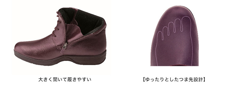本製品はブーツながら、ビジネスシューズのようなシンプルなデザインが特徴。ファスナー部の開きを従来品の約1.5倍まで広げ、着脱もスムーズです。つま先はゆったりと設計し、冬場に活躍する厚手の靴下にも対応。アッパーにはストレッチPUレザーを使用し、ソフトに足を包み込むなど、履きやすさへのこだわりが凝縮されています。
