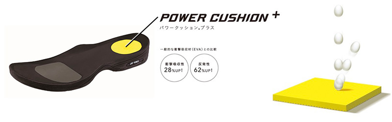 衝撃吸収性と反発性を併せ持つ「軽く、疲れにくい」衝撃吸収反発素材パワークッション。パワークッションに反発性の高い特殊樹脂を添加し、+型の溝を最適な間隔と深さで格子状に配置した新構造を採用した「パワークッションプラス」は、従来の軽量性を保ちつつ、衝撃吸収性を28%、反発性を62%アップさせ(一般的な衝撃吸収材[EVA]との比較)、12mの高さから落とした生卵が、割れずに6m以上跳ね返る新衝撃吸収反発素材です
