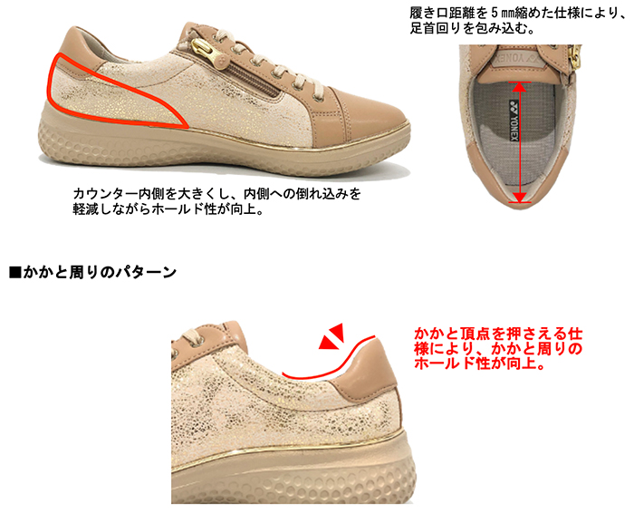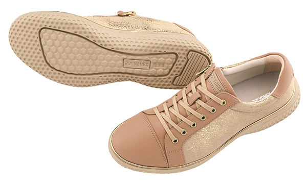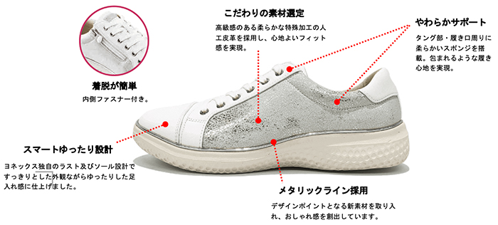 アッパーは、高級感のある特殊加工の人工皮革を用い、ソールとの接合部にメタリックラインを入れることで、華やかさとおしゃれ感を創出。つま先部は弊社独自の設計により、すっきりとした外観とゆったりした足入れ感に仕上げています。また、タング部・履き口周りに柔らかいスポンジを搭載することで、包まれるような履き心地を実現しました。