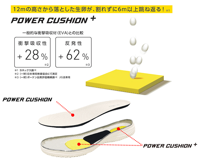 本製品は、ミッドソールの踏みつけ部とかかと部には、12m の高さから落とした生卵が、割れずに6m 以上跳ね返る※弊社独自の衝撃吸収反発素材「パワークッション®プラス」搭載により「軽い。疲れにくい。ひざにやさしい。」軽やかな歩行を支えます。