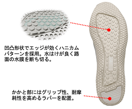 さらに、カウンター形状とかかと周りのパターンを改善し、ホールド性が向上。アウトソールには、水はけが良く、凹凸形状でエッジがきくハニカムパターンを採用。踵部には耐摩耗性に優れたラバーを採用しております。