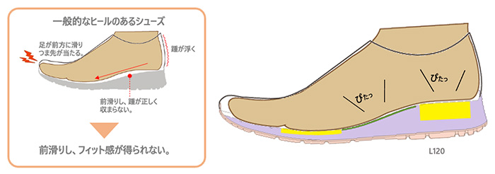 ソール上面を足裏形状に沿って設計。アーチ・かかとがフィットし靴内で足が前滑りしない安定感のある履き心地を実現。