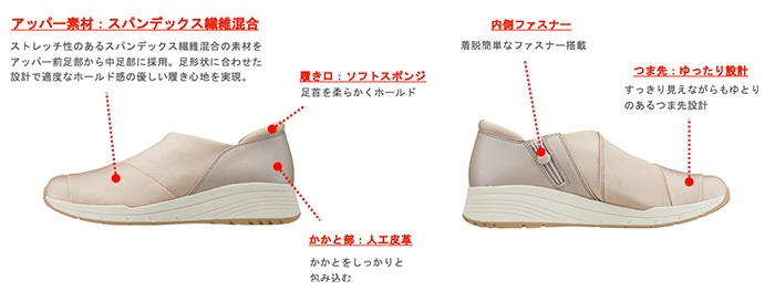 本製品は、高いクッション性に加え、様々な足形状にフィットする柔らかな履き心地を実現。女性の多様なシーン・ファッションに合わせられるデザイン性も追求したスリッポンモデルです。