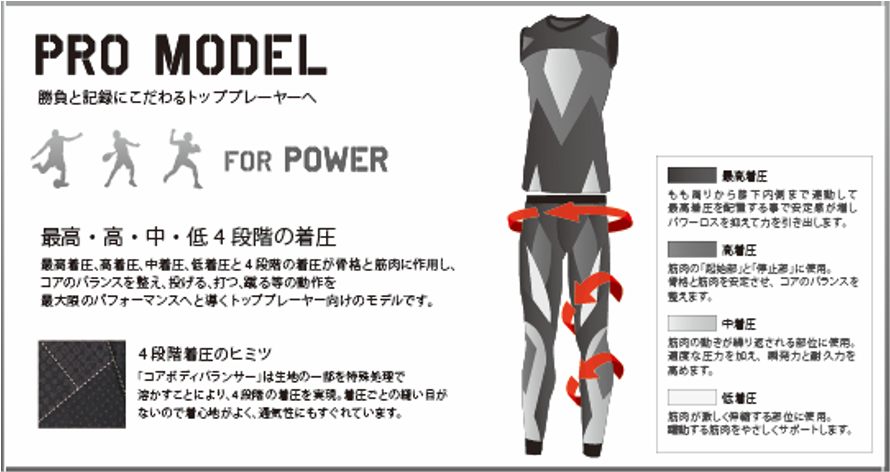 本製品は1枚の生地を特殊処理で溶かすことで4段階(最高・高・中・低)の着圧を実現した「コアボディバランサー」を採用。この4段階の着圧が骨格と筋肉に作用し、ねじり、前後、左右のあらゆる動きをサポートしながら、ハイパフォーマンスを引き出します。着圧ごとの縫い目がないため着心地がよく、通気性にも優れています。